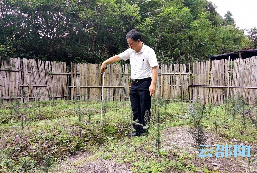 9月9日,在南山国家公园濒危珍稀植物繁育科研基地,陶志胜正在测量人工培育的资源冷杉