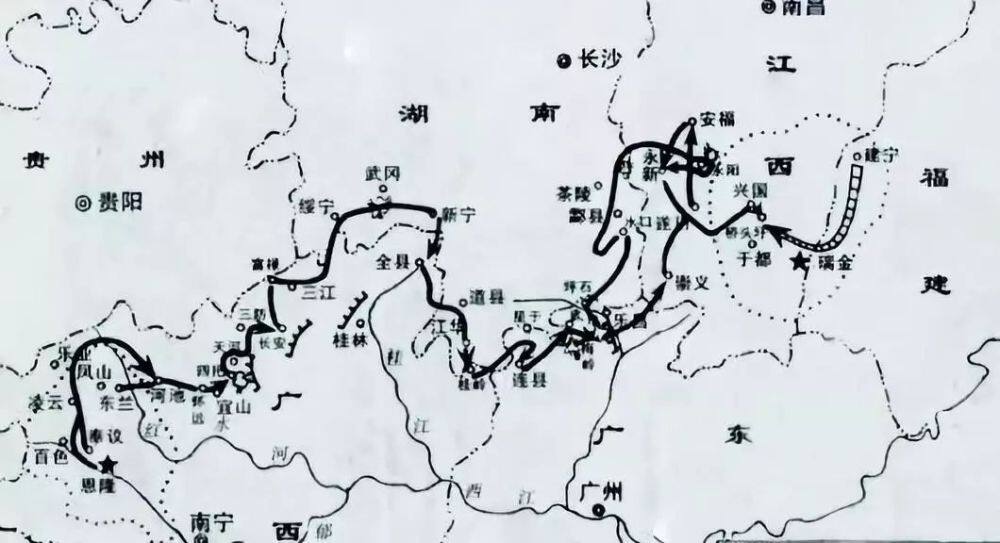 ▲红七军主力北上江西会合中央红军的路线示意图。